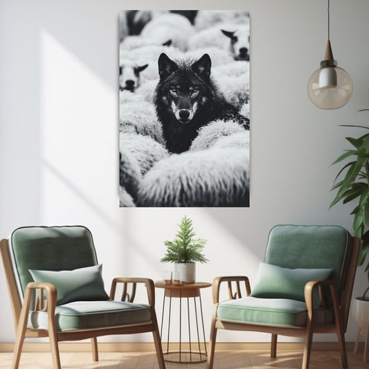 Wolf unter Schafen Wandbild Schwarz-Weiß