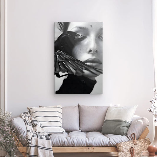 Wandbild Wohnzimmer Mädchen und Rabe Schwarz-Weiß